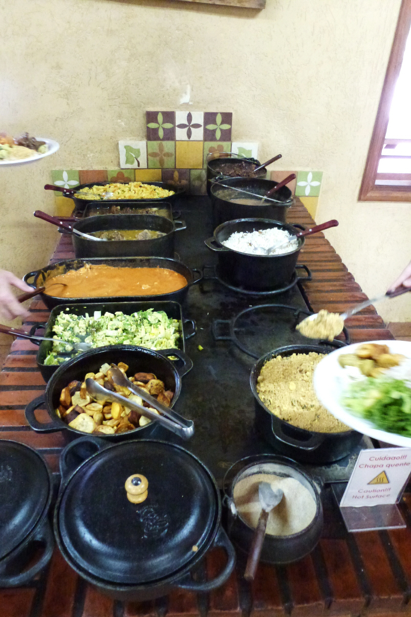 Dort haben wir am Fluss ein kleines Dorf resp. ein paar Häuser gesehen. Neben einem kleinen Restaurant dürfen wir im Schatten des grossen Baumes parkieren und gehen später essen, typischen brasilianischen Teller: Reis, Spaghetti, Böhnchen, zähes Rindfleisch und hier als Spezialität frittierten Fisch, dazu grünen Salat mit Tomaten, Rüeblisalat mit Peperoni. Nicht gerade unser Gusto. Zum Glück hat Bigi auf der Estanzia eine Wanduhr gesehen, sonst würden wir morgen eine Stunde zu früh aufstehen. Die Frau sagt uns, dass jeder Bundesstaat eine andere Uhrzeit hat. Langsam dämmert es uns: in Bonito beim Lago Azul konnten wir drei Gruppen nach vorne rutschen und bei der Schnorcheltour mussten wir eine Stunde warten. Hatten uns gewundert, dass bei so guter Organisation und vielen Touristen solche Unterschiede entstehen. Eine kurze 2-Liter Kaltwasser-Dusche ist angesagt. Kaspar schmort im eigenen Fett. Um 1 Uhr nachts hat er die gloorreiche Idee: Alle Fenster schliessen, die Dachlücke über dem Bett leicht öffnen und den Deckenventilator in der Dusche leicht laufen lassen. Dadurch kann die Luft richtig durch den Camper zirkulieren. Herrlich, am Morgen erwachen wir bei 27 Grad unter dem Duvet!
