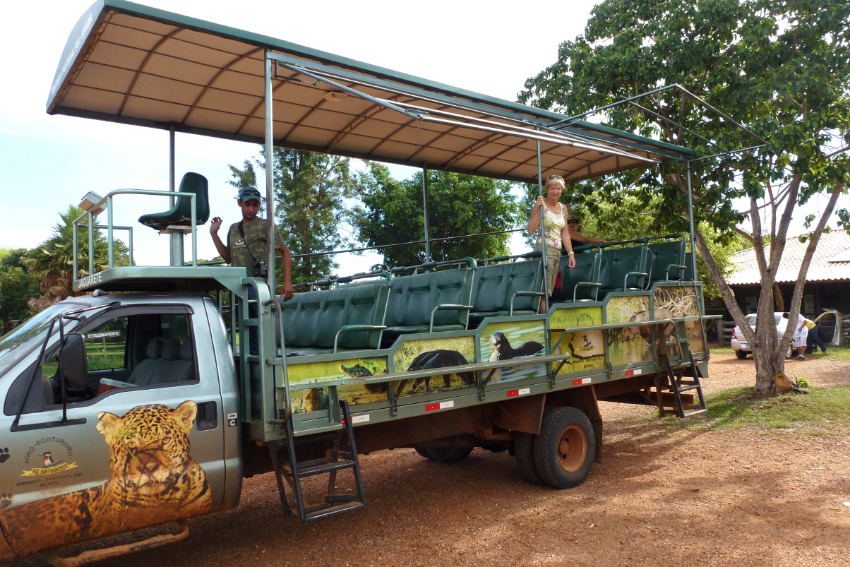 Befinden uns im Pantanal Sul (riesiges Sumpfgebiet). Fahrt zur Fazenda San Francisco. Kaspar muss mal! Beim Spülen klappt es nicht beim ersten Mal. Beim zweiten Mal springt eine Kröte raus. Kaspar stellt sich vor, wenn das seinem Fraueli passiert wäre (Herzinfarkt?). Besteigen einen Safari-Geländewagen. Es ist keine Saison, nur vier Leute. Jede Sitzreihe ist höher als die Vordere und der Guide sitzt vorne noch höher. Mit dem Stock schlägt er aufs Dach, wenn der Fahrer anhalten muss für Fotoshooting. Sehen viele Tiere: Wasserschwein, Hirsch, Krokodile und natürlich allerlei Vögel vom Storch, Papagei, Eule bis zum Falken.