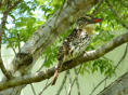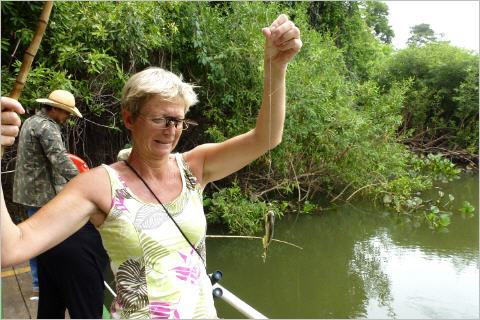 Nachmittags geht es auf die Fisching-Tour. Mit dem Jeep zum Fluss und aufs doppelstöckige Boot. Genial, von oben hat man eine speziell gute Aussicht. Fahren auf dem langsam fliessenden Fluss durch den Urwald. Auch hier viele, viele Vögel. Zwei Krokodile schwimmen uns entgegen. Am Ende der Tour wissen wir warum. Das Boot wird an einem Baum vertäut und jeder bekommt eine einfache Fischerrute. Die Führer befestigen an den Hacken Fleischköder und wir halten unsere Ruten ins Wasser. Es dauert nicht lange und kleine Piranhas hängen an den Hacken. Jedes Mal ein riesen Hallo, wenn ein Piranha angebissen hat. Bigi ist stolz, denn auch bei ihr hat einer angebissen! Die meisten Baby-Fische werden zurück ins Wasser geworfen. Vier grössere Piranhas (ca. 15 cm) bleiben im Eimer auf dem Boot.