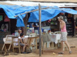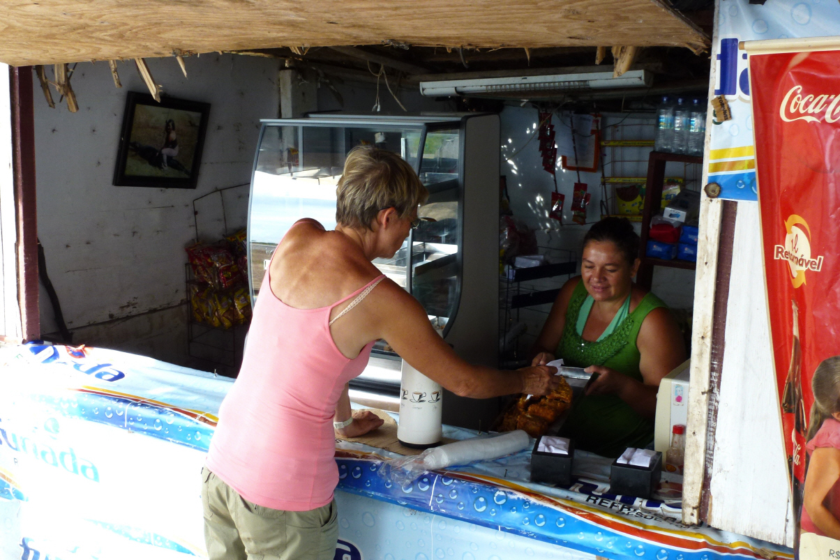 Am Morgen früh hören wir lautes Affengebrüll. Wir erinnern uns an den Pfadi/Jungschar-Song: ‚Die Affen rasen durch den Wald, der eine macht den andern kalt, die ganze Affenbande brüllt: wer hat die Kokosnuss, wer hat die Kokosnuss, wer hat die Kokosnuss geklaut……‘. Leider sind die Affen nicht zu sehen und wir dösen weiter. Zuerst muss Bigi wieder einmal ein paar Stunden Homepage am Computer erledigen. Wir entschliessen uns heute ein wenig zu waschen. Das Leintuch, aber eigentlich nützt es nicht viel, denn nach einer Nacht wird es wieder total verschwitzt sein. Bigi kocht die Abwaschlappen aus. Kaspar wird von einem miefenden Geruch verfolgt – nach längerem Weglaufen findet er heraus, dass es seine Badehose ist. Dazwischen immer wieder mal schnell unter die kalte Dusche. Am Nachmittag geht’s mit dem Computer unter dem Arm zehn Minuten zu Fuss zum Hotel. Bigi ist entsetzt über den Preis vom Internet und wir handeln auf einen Tag runter, d.h. 15 Reales (CHF 7.50). Nun können wir auch gleich mal mit der Familie in der Schweiz skypen. Klappt alles bestens. Alle klagen über den Nebel in der Schweiz. Dorli meint auch, dass die Hitze bei uns ja nicht gerade gesund sei. Aber wo sollen wir denn die Heizung ausschalten?!