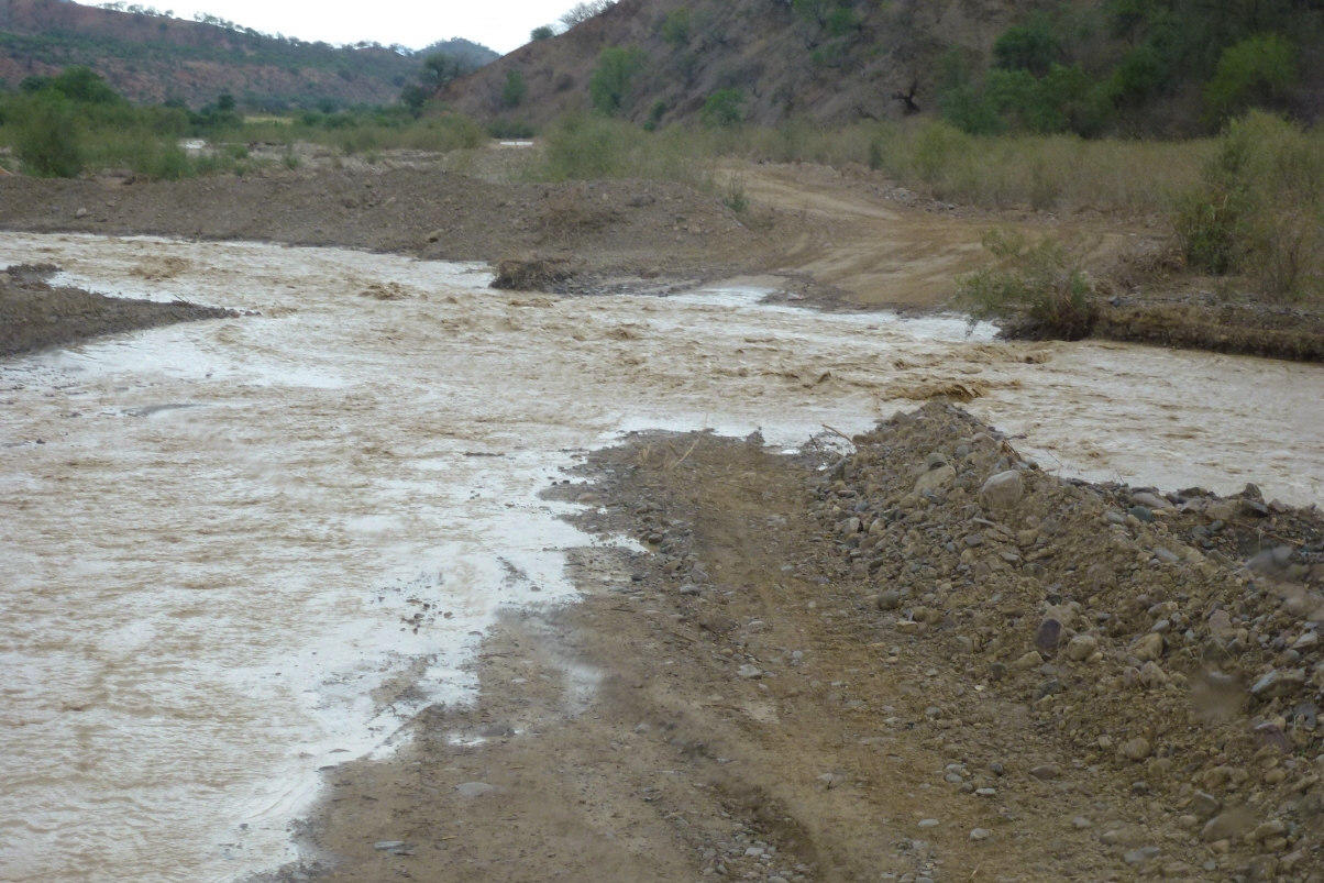 Über rutschiges Geröll zur Brück runter und Kaspar landet wieder einmal unsanft auf dem Hosenboden. 30 km vor Potosi steht ein bröckliges Werbeschild ‚Thermas Chaqui‘. Bigi findet dies einen Umweg wert. Wir sind nicht sicher, ob die Thermen überhaupt existieren. Wollen schon umkehren, aber Kaspar will noch etwa 8 km weiter.