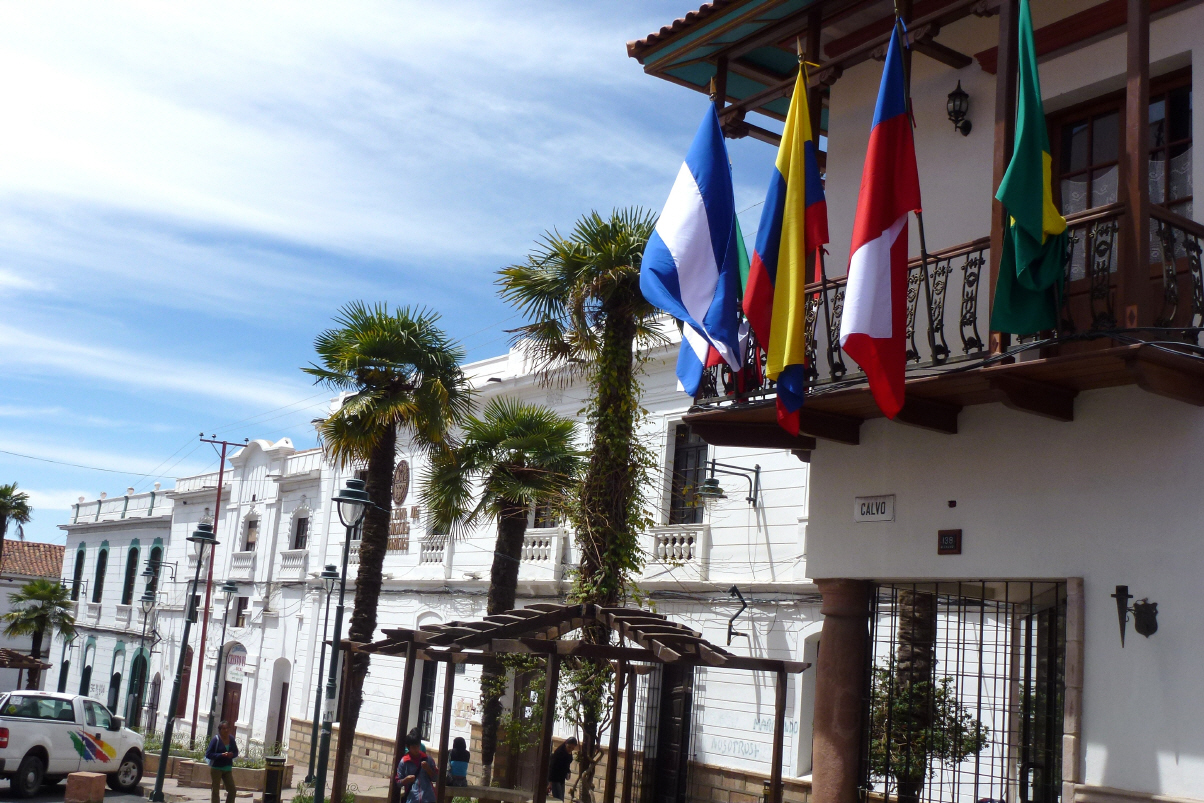 Kreuz und quer hinunter zum Hauptlatz ‚25 de Mayo‘. Aus dem ersten Stock eines Restaurants beobachten wir den lebhaften Platz. Im Tourist Office buchen wir einen bolivianischen Kulturabend mit Essen, Tanz und Musik. Die Kathedrale ist nur über das Kirchenmuseum zugänglich. Hier bewundern wir die Kirchenschätze. Später noch das Museo ‚Casa de la Libertad‘. Hier wurde 1825 die Unabhängigkeit Boliviens ausgerufen. Seither gab es 65 Präsidenten! 15 davon wurden ‚um die Ecke gebracht‘. Kürzeste Amtsdauer war grad mal 4 Tage. Sucre ist nur noch nominell die Hauptstadt. Ausser dem nationalen Gerichtshof sind alle Ministerien in La Paz.