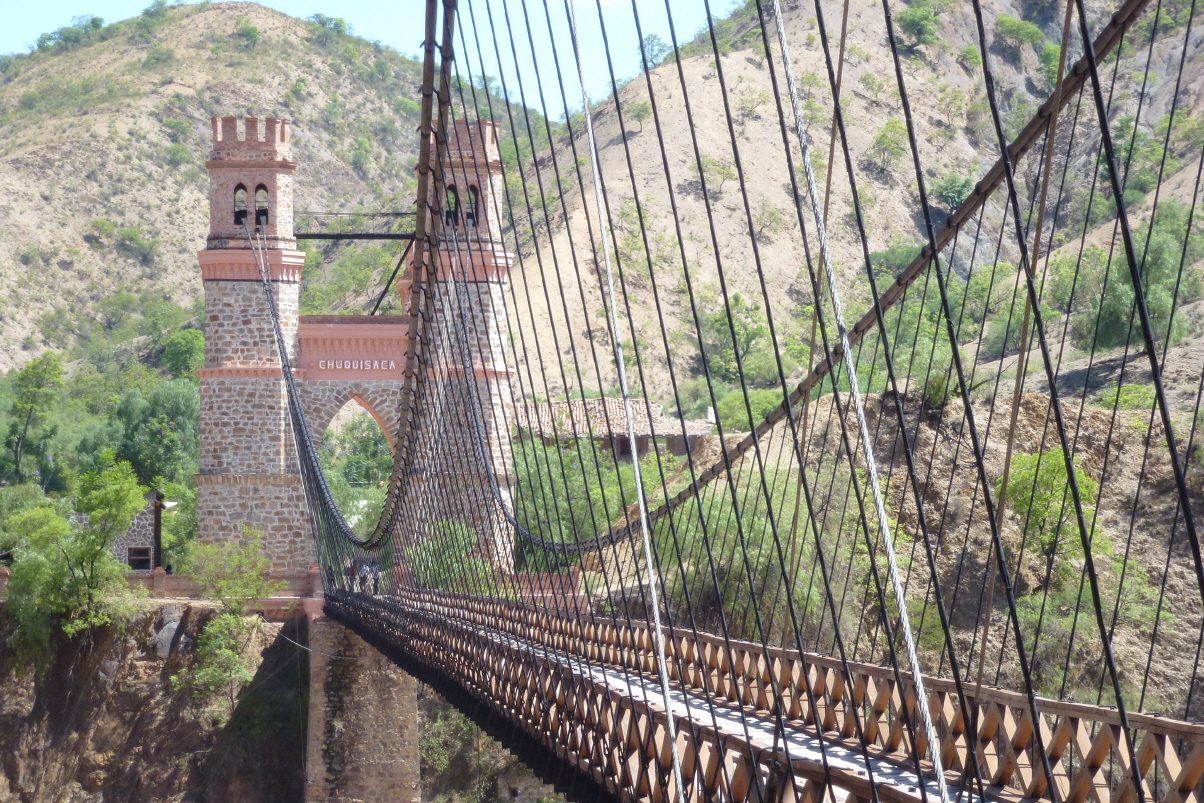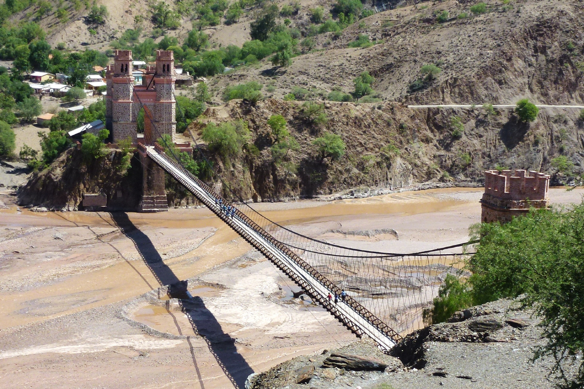 Bigi lotset Kaspar aus der Stadt hinaus. Schmale Strassen, aber wir finden die Asphaltstrasse nach Potosi relativ einfach. In Puente Mendez sehen und fotografieren wir die alte, aber gut renovierte Hängebrücke.