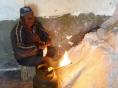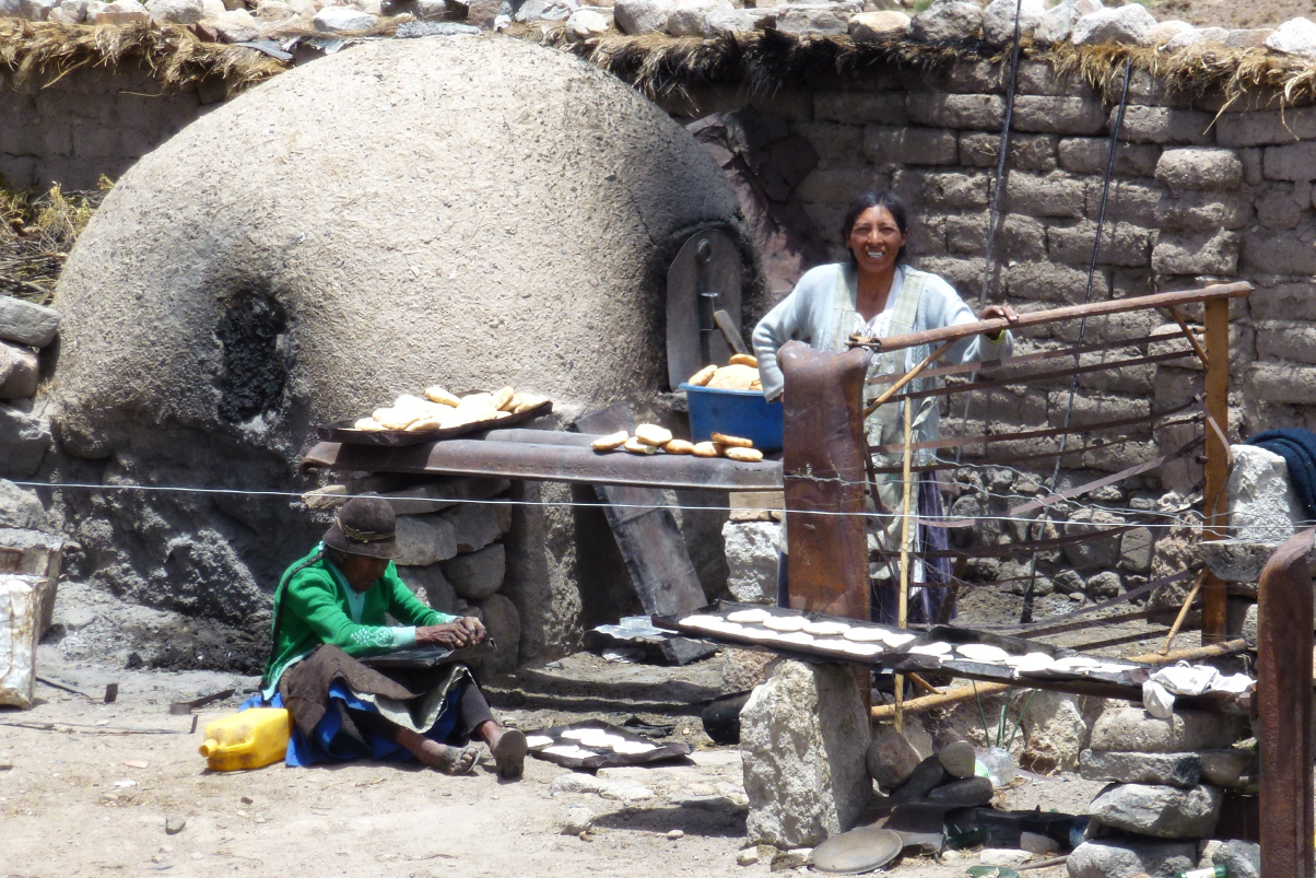 Die schmale, nur drei Meter breite Strasse, folgt ca. 50 km der Eisenbahnlinie nach Potosi. Die Naturstrasse ist recht gut zu befahren, kein Wellblech. In einem kleinen Ort können wir gerade mit verfolgen, wie zwei Frauen im Holzofen Brot backen. Bigi raus aus dem MAN und sie kauft sechs kleine, runde Brote. Kaspar fotografiert die Szene aus Distanz.